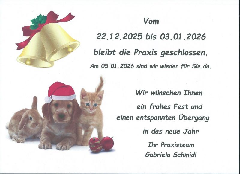 Die Praxis bleibt vom 22.12.2025 bis zum 03.01.2026 geschlossen! In dringenden Notfällen wenden Sie sich bitte an die